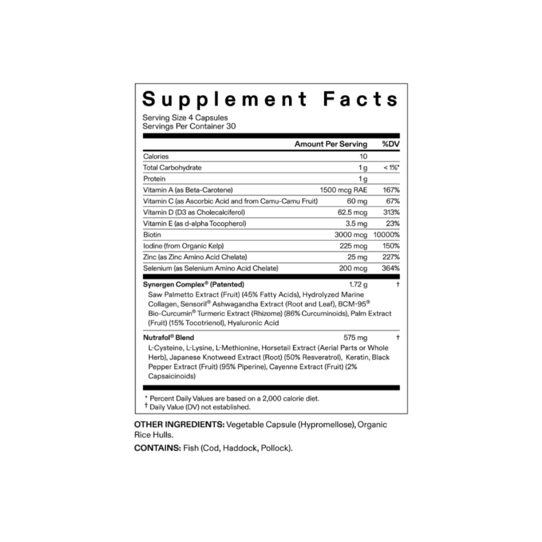 主な成分ビタミンA、C、D、E、の他ビオチン、有機昆布由来のヨウ素、亜鉛、セレン、ナトリウム。加水分解海洋コラーゲンアシュワガンダエキス、ノコギリヤシエキス、BCM-95バイオクルクミンウコンエキス、ヤシエキス、ヒアルロン酸、l-リジン、l-エチオニン、l-システニン、スギナエキス、イタドリエキス、黒胡椒エキス、カイエンエキス